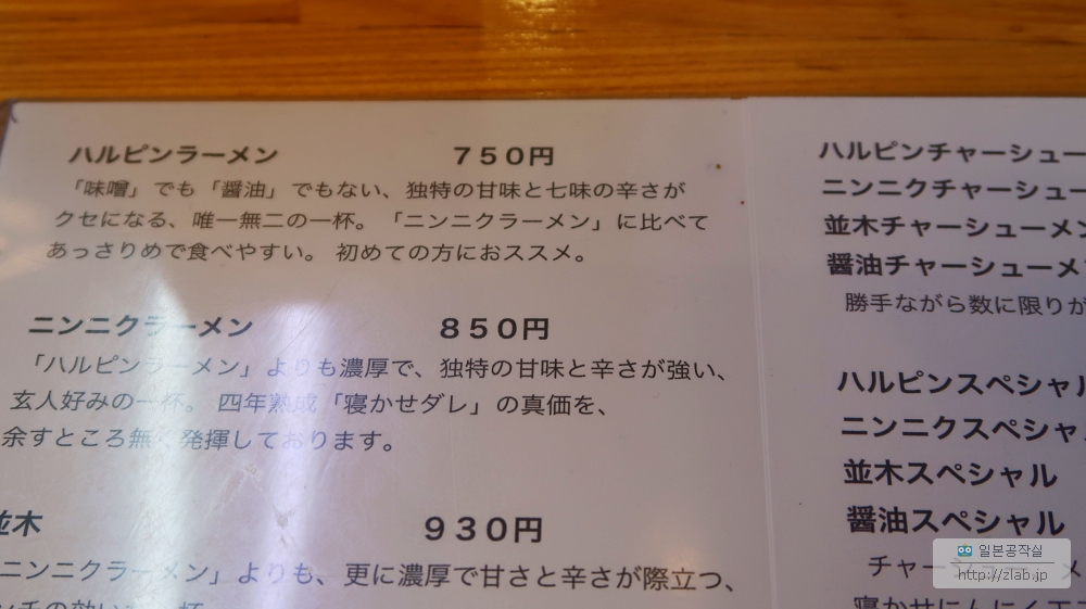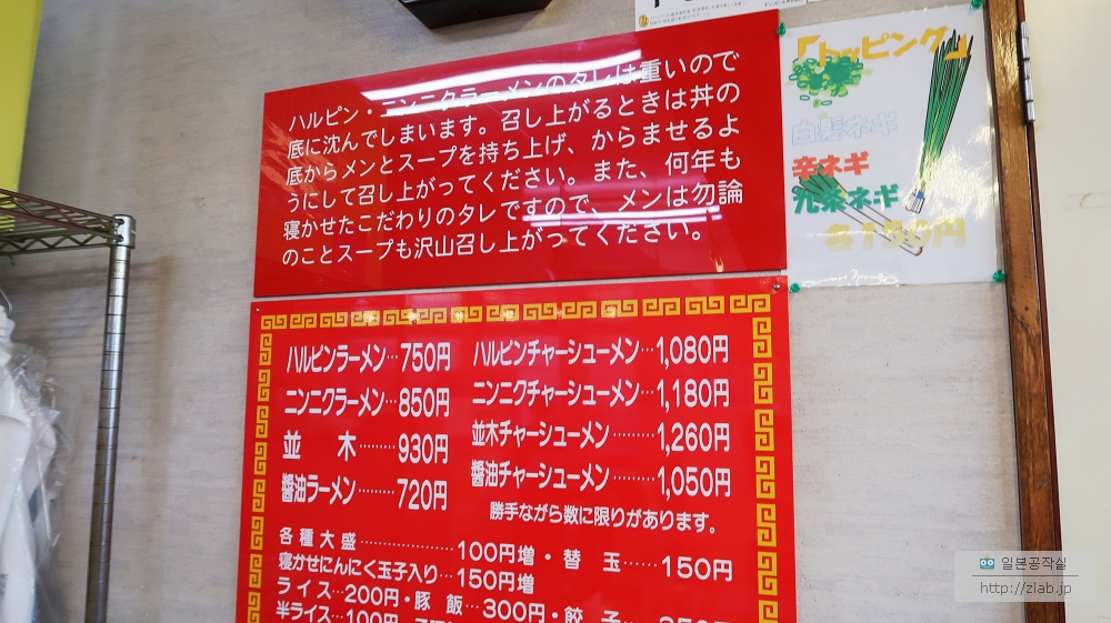 일단 본점이 여기고 제자들 넷이 스와근방에 지점을 차리고 있구요. 2차대전때 선양에 갔던 본점 점주의 아버지가 거기서 묵힌 마늘장을 먹어보고 반했데요. 그래서 그거 만드는법을 배우고 일본에 돌아와서 라멘을 만들고 그걸 포장마차에서 팔기 시작했는데 그게 인기를 끌어서 가게를 내게 되었다고 해요.