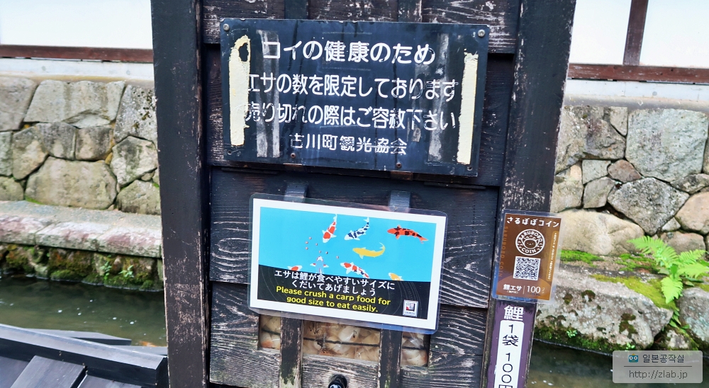 먹이는 100엔으로 전분으로 만든 일본의 보존식품인 후였고 무인판매기에서 살 수있어요.