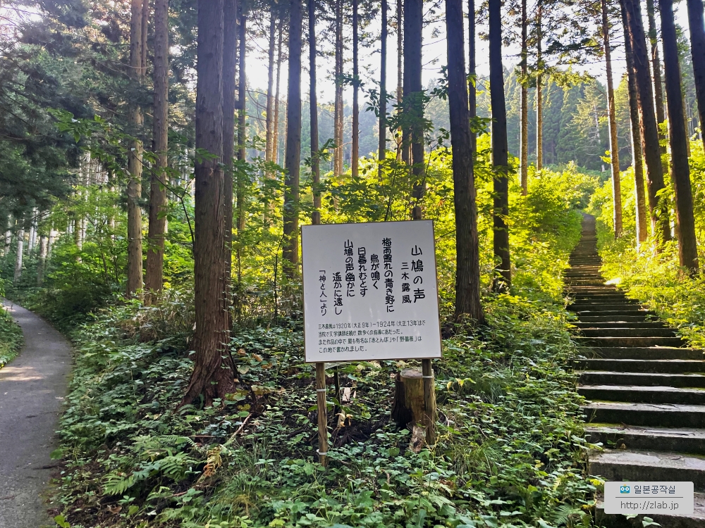 성당이 길입구쪽에 있던게 좀 다르고 나무가 없어서 그런지 규모가 좀 작아보여요 ㅋㅋ 뒤에 위에서 본 들장미가 써있는데 그 옆에 빨간잠자리(赤とんぼ)란 유명한 옛날동요도 미키선생의 시에요. 옛날 사진에 남아있는 아래 오른쪽에 있는 집이 미키선생이 살던 집이라고 하구요.