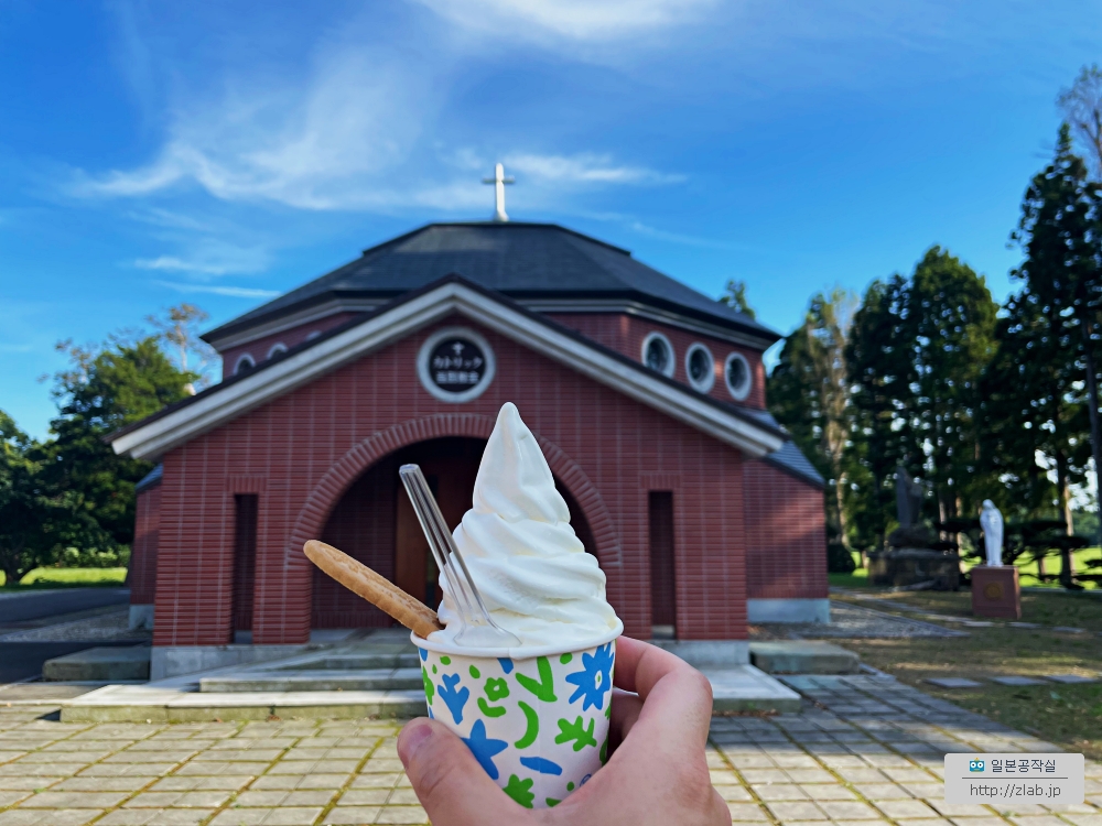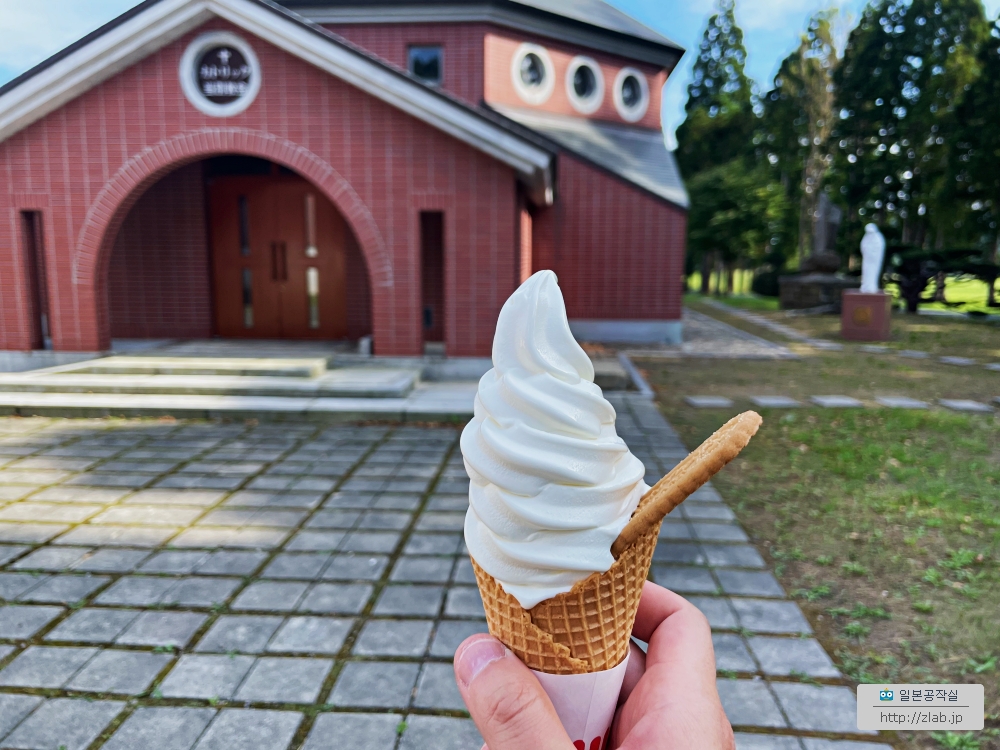하나에 4백엔이었는데 컵과 콘을 고를 수 있어요. 매점에선 아이스크림말고도 쿠키나 버터, 성물들도 구입할 수 있었어요. 매점옆엔 성당이 있었는데 이 동네의 본당인 当別토베츠성당이었어요. 안에 들어가볼려고 했는데 문이 잠겨있더군요.